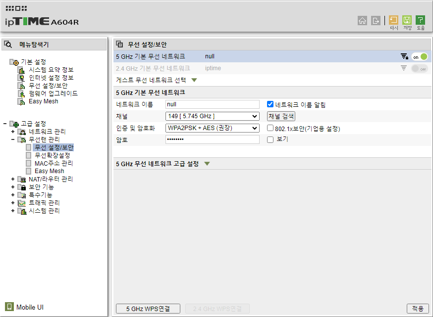 [관리도구] -> [고급설정] -> [무선랜 관리] -> [무선 설정/보안] 을 순서대로 클릭한다.